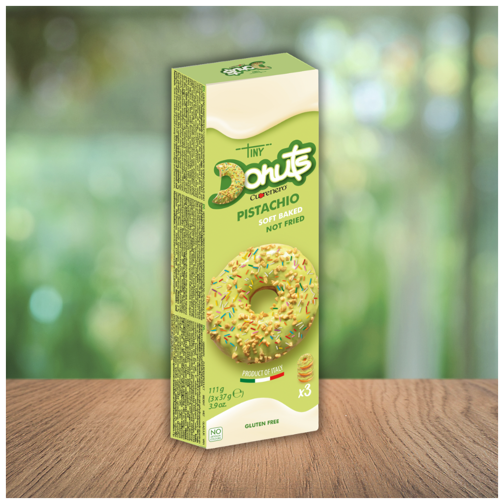 Italský pečený výrobek s duhovým posypem a pistáciovou polevou. Donuty jsou výborné jako svačinka na výlety, do práce, pro děti do školy, ale i jako skvělý zákusek ke kávě či čaji.